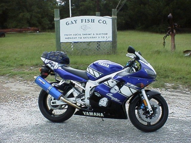 Fripp Island. I finished my ride and made it back into Beaufort. I highly recommend you at least do this route one time. Highway 21 on the island before Fripp is really long and straight in some places. It's really bumpy, but it's more like dips in the road. So at 85+ MPH, it's LOTS of fun! Be careful of dears and snakes out here. Everyone on that road usually drives about 55. Don't cross the bridge to Fripp Island, the guards at the gate look at you real funny when you don't stop, but turn around and do a wheelie out on the entrance LMAO I made one little stop at the Gay Fish Company to take a picture of the sign. |